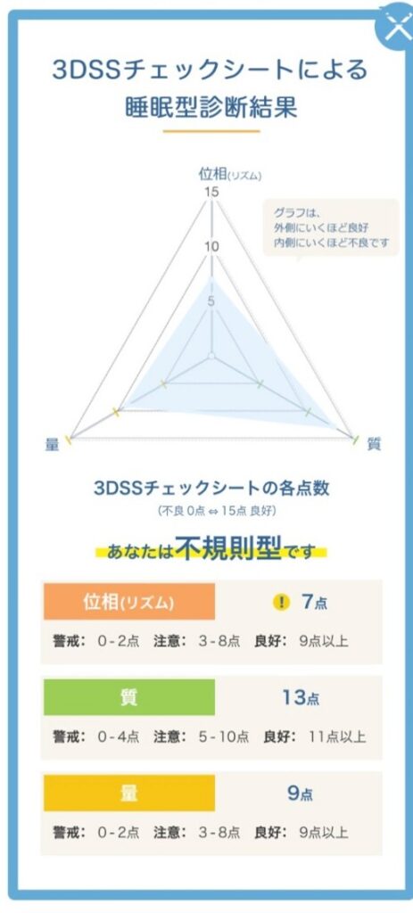 3DSS(3 次元型睡眠尺度)とは、個人の睡眠習慣を“位相(リズム)”、“質”、“量”の3 点から把握することが出来る尺度です。 24 時間型社会となった現代では、睡眠の不規則・夜型化が問題となっており、位相(リズム)に関する問題についても評価する必要があります。3DSS はこれら3 点を同時にかつ個々で点数化することにより、いずれに問題があるのかをすぐに把握できることが特徴です。